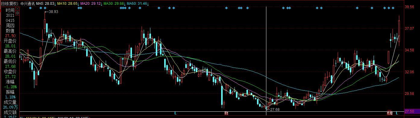 同花顺(300033)行情显示,中兴通讯从4月份见底后,股价从27.68元一路拉升到37.94元,涨幅超过37%,远远跑赢大盘。