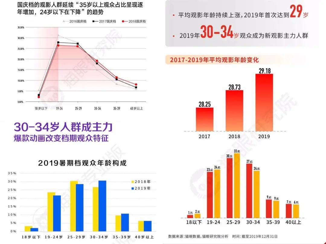 早在2018年,猫眼数据就复盘了2016年-2018年三年暑期档观众画像,指出“35岁以上观众占比逐年增加,24岁以下观众下降”的趋势,当时就有不少媒体对年轻人不去电影院提出了担忧。到了2019年暑期档,趋势仍在持续。在疫情来临前的2019年全年报告里显示,平均观影年龄持续上涨,首次达到29岁,同时,30-34岁观众成为新观影主力人群。