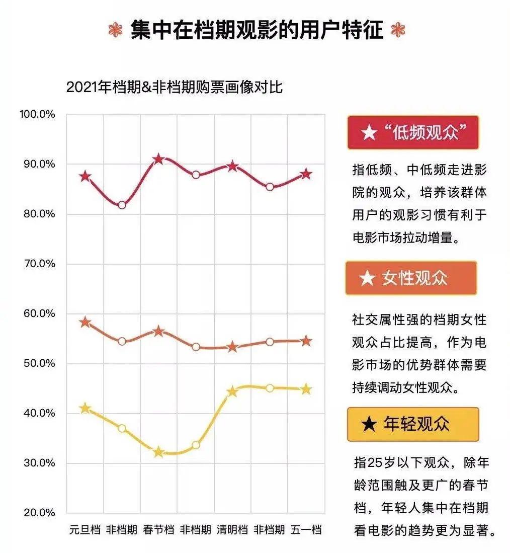 2020年情况特殊,疫情后出现报复式观影潮,年轻观众们曾回到过电影院,复工后最近的档期即为2020年暑期档,当时24岁以下观影人群占比由2019年同期的29.5%暴涨至39.4%,但随后占比在2020年国庆档、2021年春节档再接连下滑,直到2021年五一档,占比又明显回升,不过也是这一次,猫眼研究院解析指出,年轻人集中在档期看电影的趋势更为显著。
