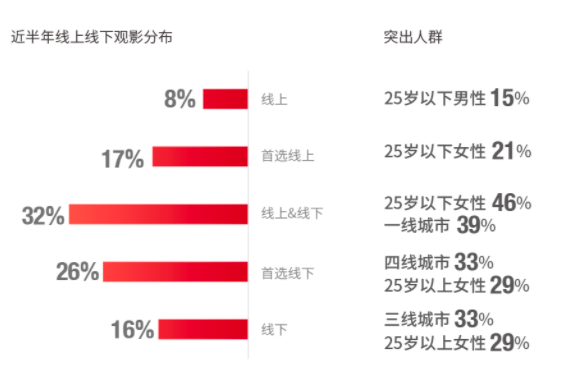 在内容的播放渠道上,线上视频以其便捷性,分走了一部分对大银幕没有追求的观众。一个可以参考的数据是,2018年、2019年、2020年近三年观众平均观影频次分别为3.06、2.88、1.73次,频次明显下降。猫眼数据对观影人群进行分析,尽管首选线上观影的人群没有线下的多,但首选线上的人群里,25岁以下年轻观众明显居多数。