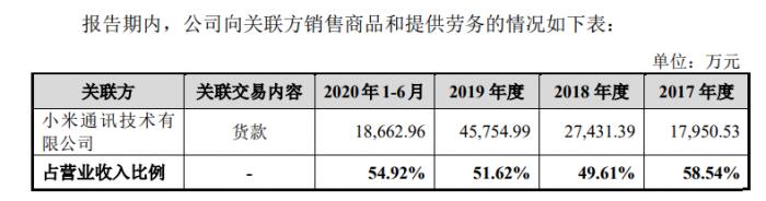 趣睡科技2018年至2020年报告期,在小米系列平台的主营收入分别达3.83亿元、4.17亿元、3.26亿元,占其当期主营收入的比例分别高达79.81%、75.56%、68.2%。而2017年至2020年上半年,易来智能来自小米的关联销售合计占其全部营收的比例分别为58.54%、49.61%、51.62%和54.92%。