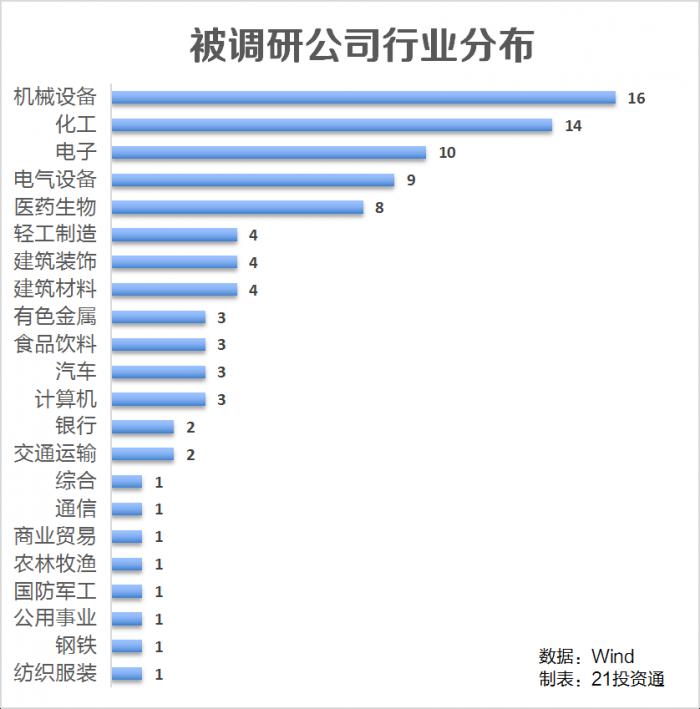 从行业分布来看,机械设备最受机构青睐,有16家公司获调研,包括景津环保(603279.SH)、杭氧股份(002430.SZ)、汉钟精机(002158.SZ)等;化工行业紧随其后,有14家公司获调研。其次是电子和电气设备,分别有10家、9家公司获调研。