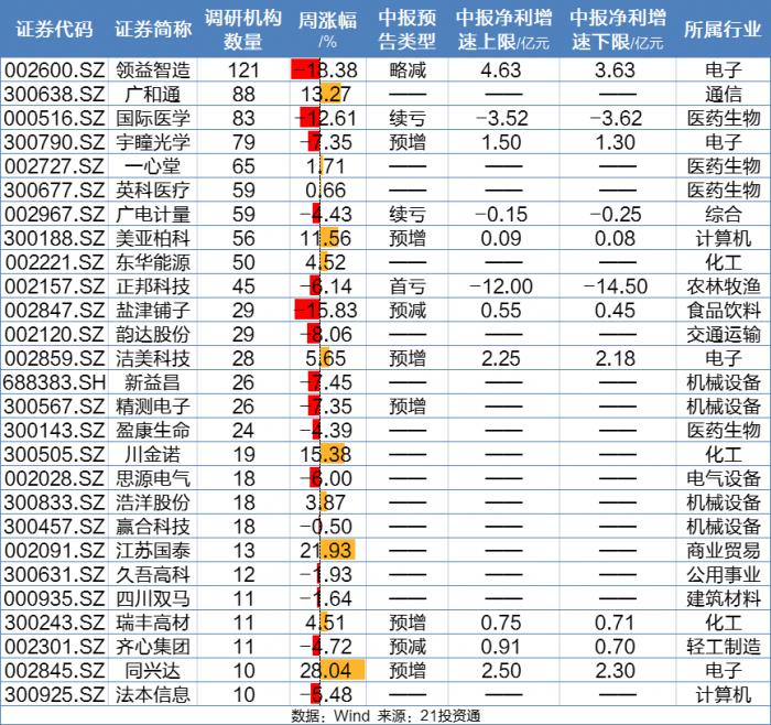 最近一周被10家或以上机构调研的个股名单: