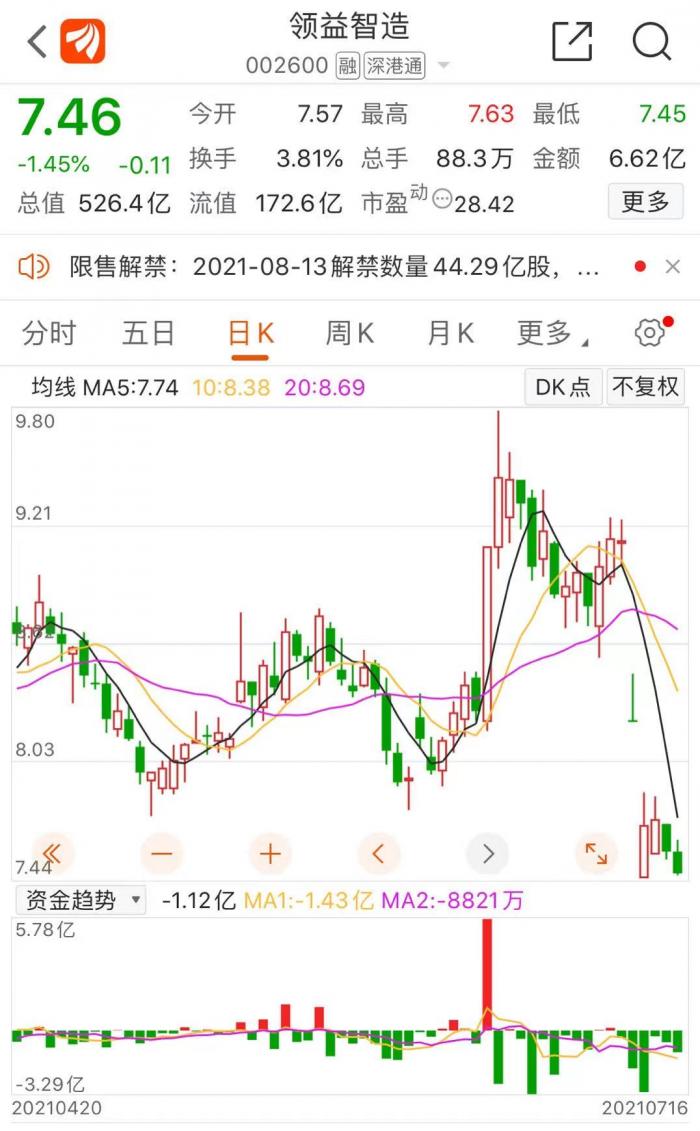 需要注意的是,8月13日领益智造将迎来44.29亿股解禁,远超目前的流通量。