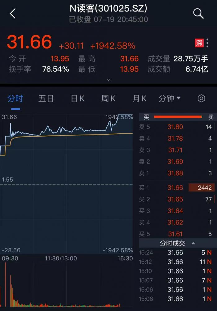 7月19日,读客文化(301025.SZ)在深交所创业板上市。