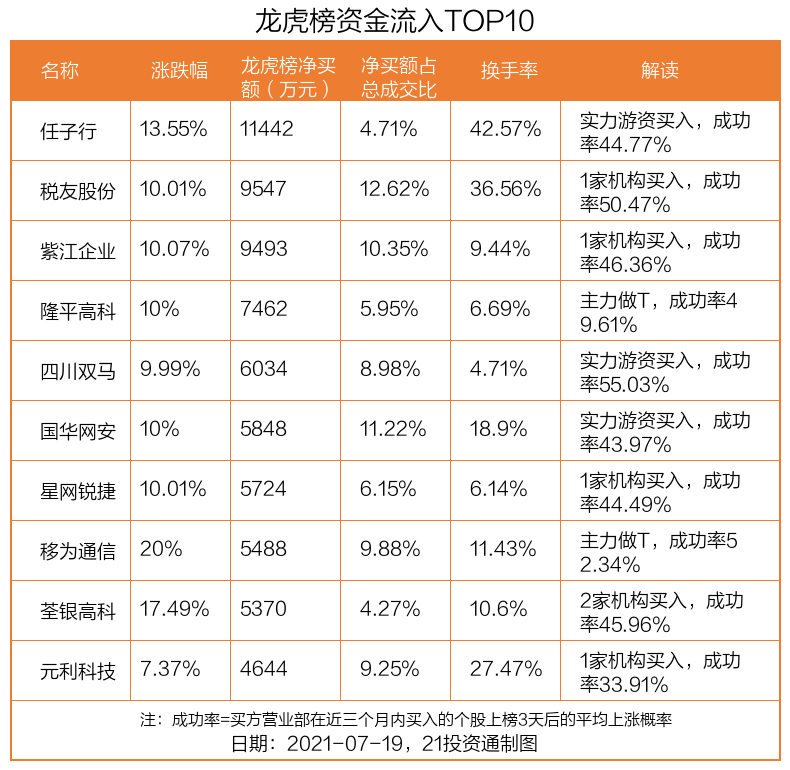 盘后龙虎榜数据显示,共有42只个股因当日异动登上龙虎榜,资金净流入最多的是网络安全概念股任子行(300311.SZ),达1.14亿元。