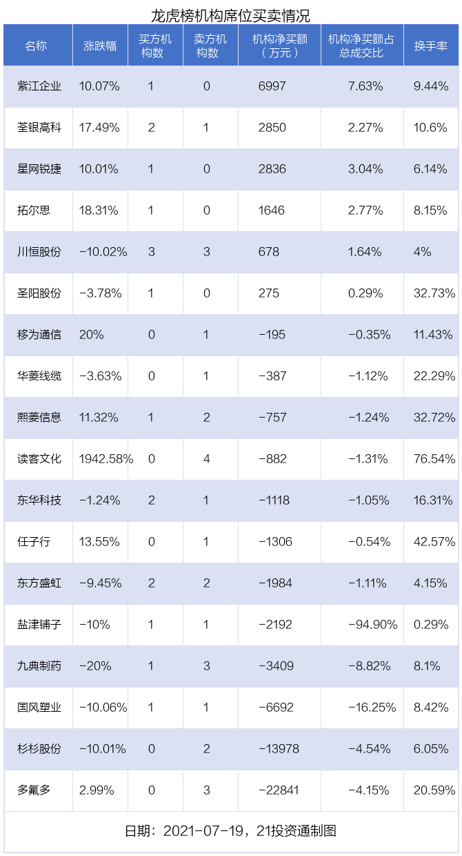 其中,机构净买入金额最多的是创投概念股紫江企业(600210.SH),当日收盘上涨10.07%,换手率为9.44%。前五大买卖营业部中有1家机构,为合计净买入6997万元,占总成交金额的7.63%。