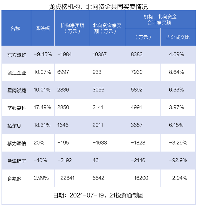 值得注意的是,机构和北向资金共同净买入了星网锐捷、荃银高科、拓尔思、紫江企业等4股;共同净卖出了移为通信;在东方盛虹,多氟多,盐津铺子上出现分歧,机构净卖出东方盛虹1984.27万元,北向资金净买入1.04亿元;机构净卖出多氟多2.28亿元,北向资金净买入6641.61万元;机构净卖出盐津铺子2191.61万元,北向资金净买入46.02万元。