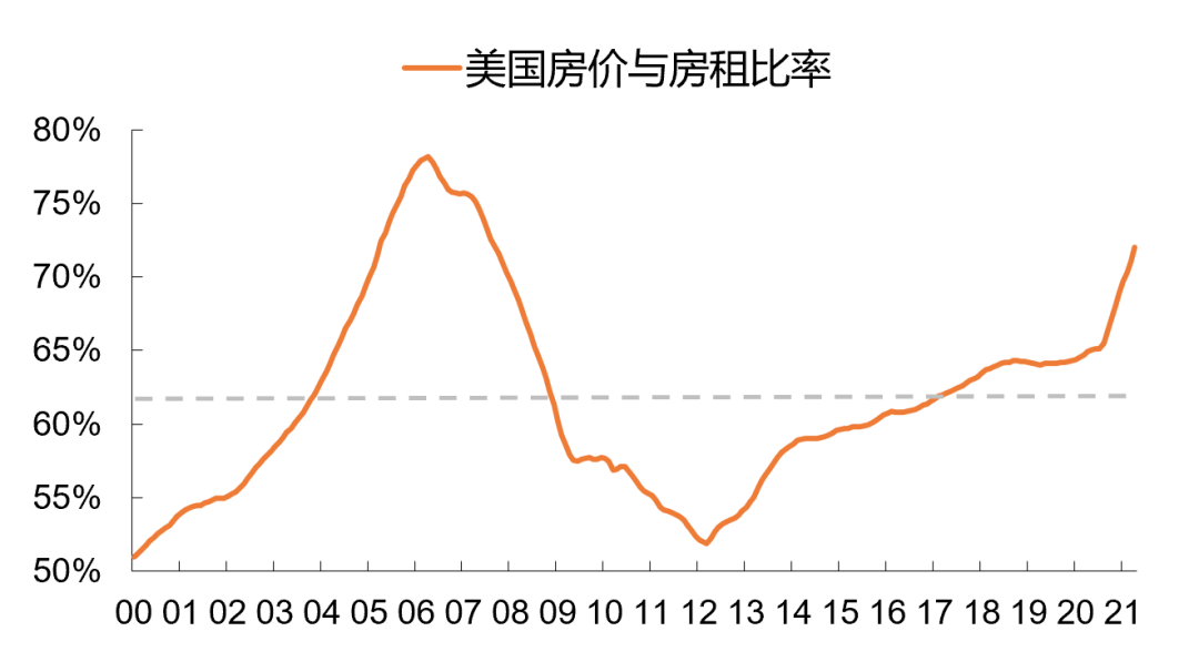 最重要的问题在哪?就是房价与房租的比率。大家现在都很关心美国的通胀,在美国的通胀指数(消费品价格)中,有一个非常重要的权重就是房租。