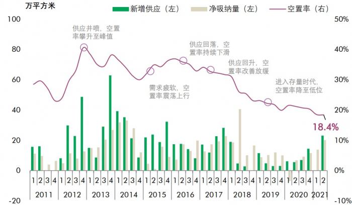 随着疫情在全国范围内获得控制,2021年全国的商务活动快速回暖,也推动了成都的写字楼市场吸纳量大幅上升。世邦魏理仕的数据显示,上半年成都的写字楼市场空置率降至自 2005年来的新低,仅为18.4%。而在2012年,成都的写字楼空置率一度接近40%。