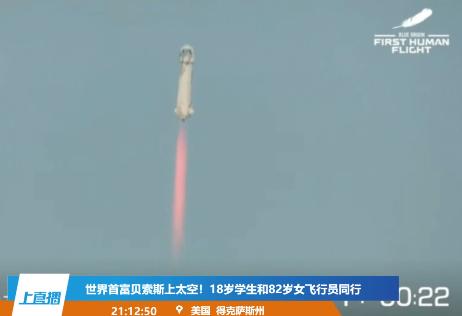 当地时间7月20日上午,世界首富、美国亚马逊公司创始人杰夫·贝索斯乘坐“新谢泼德”号火箭升空,开启首次太空之旅。约7分钟后,助推火箭在指定位置着陆,近11分钟时,载有贝索斯等人的太空舱顺利着陆,蓝色起源首次载人太空之旅取得成功。