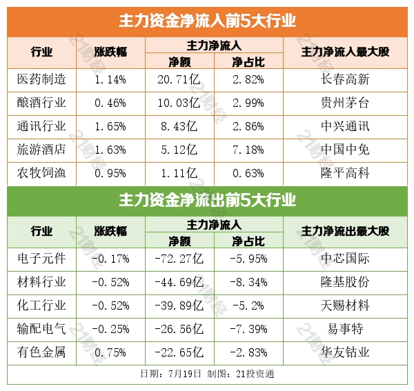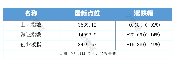 7月19日,A股三大股指早盘震荡,沪指探底跌近1%后反弹,深成指、创业板指则呈现冲高回落走势;午后三大股指集体震荡下行,随后集体翻红,尾盘A股陷入震荡整理走势之中。电信运营、民航机场、旅游酒店、通讯行业、医药制造等涨幅靠前,钢铁行业、装修装饰、电力行业、化纤行业、造纸印刷等跌幅靠前。