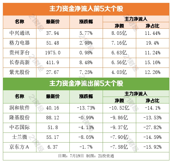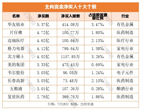 据21投资通(微信号ID:touzit21)智能监测,7月19日,北向资金净买入43.74亿元,其中沪股通净买入11.75亿元,深股通净买入31.99亿元。