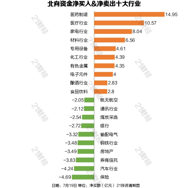 北向资金增持了36个行业,其中医药制造居首,净买入金额达14.95亿元,其次是医疗行业,净买入10.57亿元。