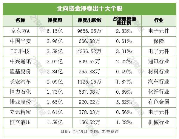 北向资金净卖出京东方A(000725.SZ)、中国平安(601318.SH)、TCL科技(000100.SZ)、中兴通讯(000063.SZ)、隆基股份(601012.SH)居前。