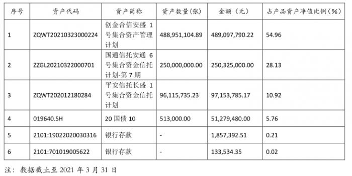 第三大持仓“平安信托长盛 1 号集合资金信托计划”占比10.92%,其截至2021年3月31日所投资资产类别情况为银行存款占比9.65%,交易性金融资产占比29.24%,买入返售金融资产占比15.97%,应收利息占比1.32%,持有至到期投资占比53.41%。