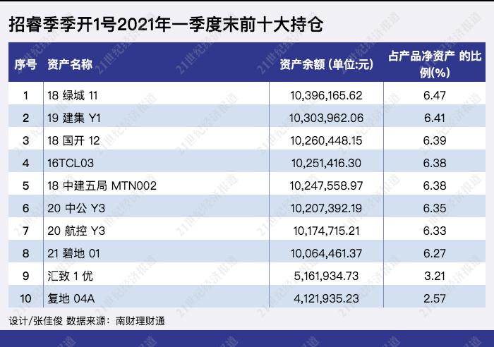 从2021年一季度末前十大持仓来看,“招睿季季开1号”重仓多为债券类资产,包含信用债、ABS、金融债等。融资方涉及房地产行业、基建行业、金融行业等。
