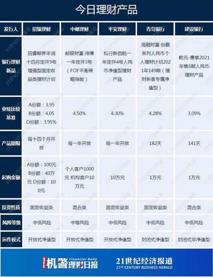 《机警理财日报》是南财理财通、21世纪经济报道旗下投资理财专栏,旨在帮投资者守好“钱袋子”。日报根据产品的投资性质对产品数据进行人工整理,每日内容各有侧重,周一聚焦固收+产品、周二纯固收产品、周三现金管理类产品、周四混合类产品、周五权益类产品,每周一至周五每日更新,尽在21财经APP,敬请关注!