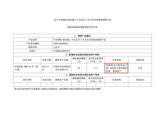 值得注意的是,南财理财通课题组查阅平安理财该产品官方公告发现,“新启航三个月定开3号”6月底以来新增两笔非标投资,6月25日新增一笔投向信托计划“外贸信托-晴虹 60 号(第17期)”的非标投资,理财资金认购信托计划,实际用于购买蚂蚁花呗、借呗资产,约定年化收益率5.4%;6月29日,该产品又新增一笔投向“中原财富-成长841期-前海融通财产权信托”的非标投资,融资客户为深圳市前海融通商业保理有限公司,融资期限84天,项目约定年化收益率5.19%。