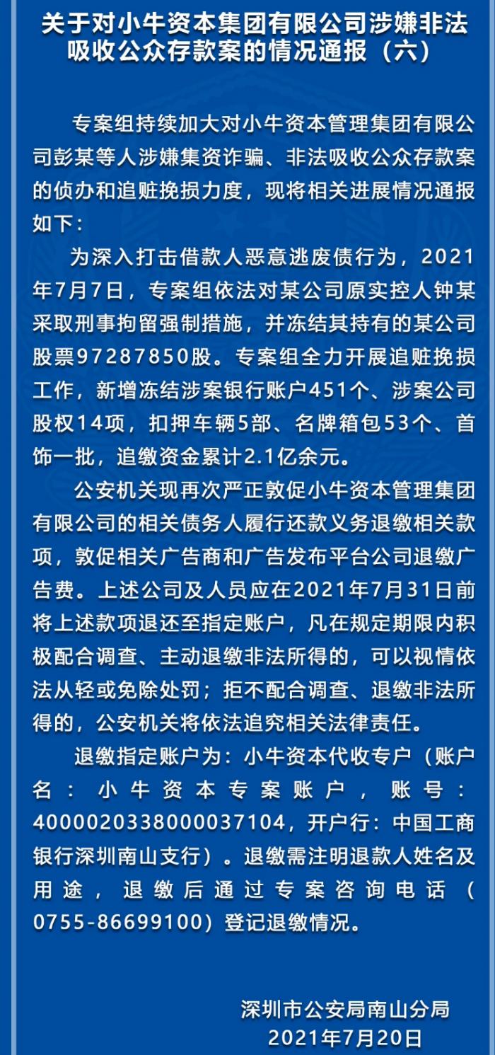 7月20日,深圳市公安局南山分局官方微信公众号“深圳南山公安”发布最新关于对小牛资本管理集团有限公司(下称“小牛资本”)涉嫌非法吸收公众存款案的情况通报。7月7日,专案组依法对某公司原实控人钟某采取刑事拘留强制措施,并冻结其持有的某公司股票。专案组全力开展追赃挽损工作,新增冻结涉案银行账户451个、涉案公司股权14项,扣押车辆5部、名牌箱包53个、首饰一批,追缴资金累计2.1亿余元。