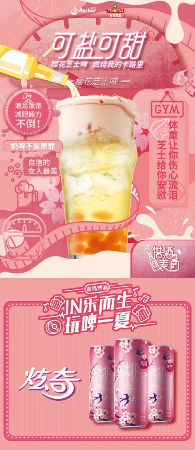 以青岛啤酒和安佳、乐乐茶的奶盖啤酒联名为例,青岛啤酒在炙热盛夏开启“玩啤一夏”的品牌策略,洞察到了市面上的网红饮料“奶盖茶”,以此为灵感,联合安佳研发首创了“奶盖啤酒”。一系列的创意调味啤酒,符合年轻受众的多种口味,成为新的创意引爆点。