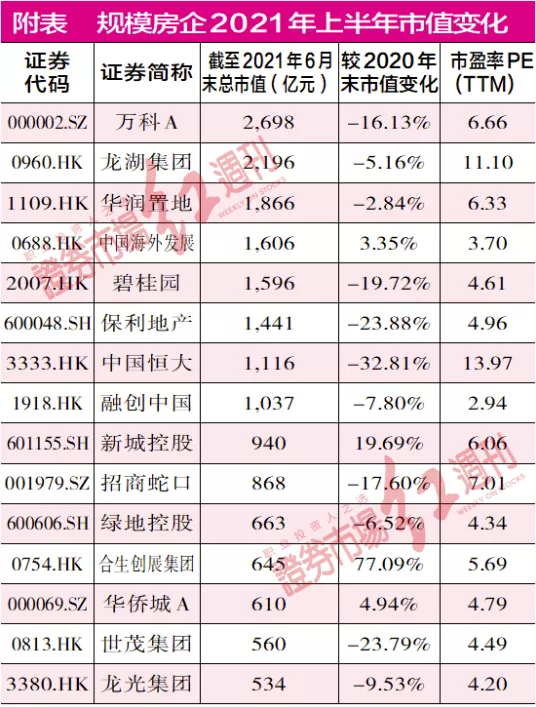 2021年上半年,地产板块市值普遍缩水。东方证券研报指出,2020 年上半年,申万地产指数上半年绝对涨幅-9.2%,跑输沪深300指数10.9个百分点,在28个行业中排名倒数第六,仅仅超过了钢铁、交运、非银、金融和采掘行业,而排名前五的医药、休闲、电子、食品饮料、计算机5个行业涨幅均在20%以上。国信证券则指出,纵向来看,目前地产板块估值仍处于近10年较低水平。
