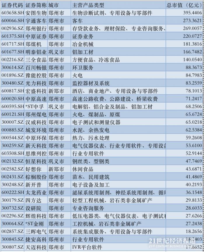 郑州当地的A股龙头公司有安图生物、宇通客车、郑州银行、中原证券、郑煤机、明泰铝业、三全食品,市值均在100亿元以上。31家公司的行业分布有生物诊断、汽车制造、冶金、食品、专用设备制造等。