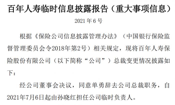 7月20日,21世纪经济报道记者注意到,百年人寿保险股份有限公司(下称“百年人寿”)在其官网披露消息称,经公司董事会决议,同意单勇辞去公司总裁职务,自2021年7月6日起由副总裁孙晓红任公司临时负责人。