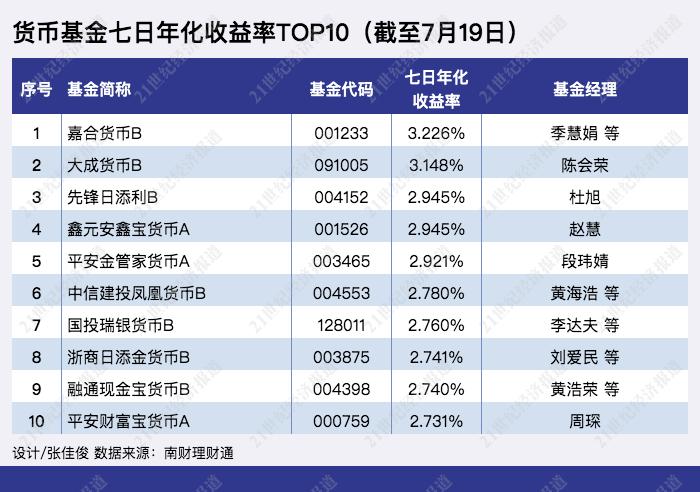 为了更深度分析现金管理类银行理财产品,课题组选取了货币基金进行对比。截至7月19日,仅有2只货币基金七日年化收益超3%。“嘉合货币B”七日年化收益率3.226%,在此次榜单中排名第一。与上文理财子公司现金管理类产品收益排名第一的中银理财“乐享7天”高达3.344%收益相比,货币基金可谓“跑输”银行现金,上榜的货币基金大部分产品七日年化收益率低于3%,而南财理财通统计的理财子公司现金榜单中,前10款产品收益率均超过3%,总体而言,银行理财现金类产品比货币基金更值得投资者关注,或者说投资“性价比”更高。