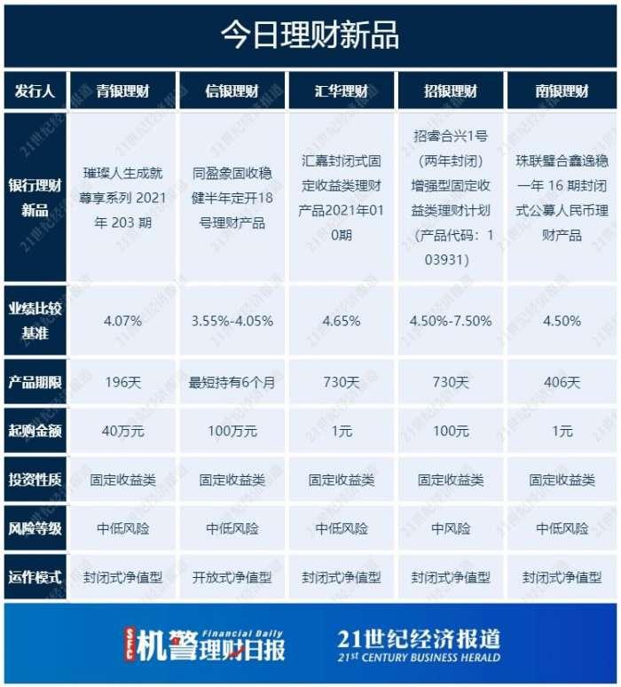 据南财理财通数据显示,近期,多家理财公司发售的新品中,青银理财推出的“璀璨人生成就尊享系列2021年203 期”产品业绩比较基准为4.07%。该产品针对经青银理财评估为稳健型及以上级别的个人投资者,认购起点为40万元,封闭期为196天,中等风险等级,募集期从7月20日至7月26日。