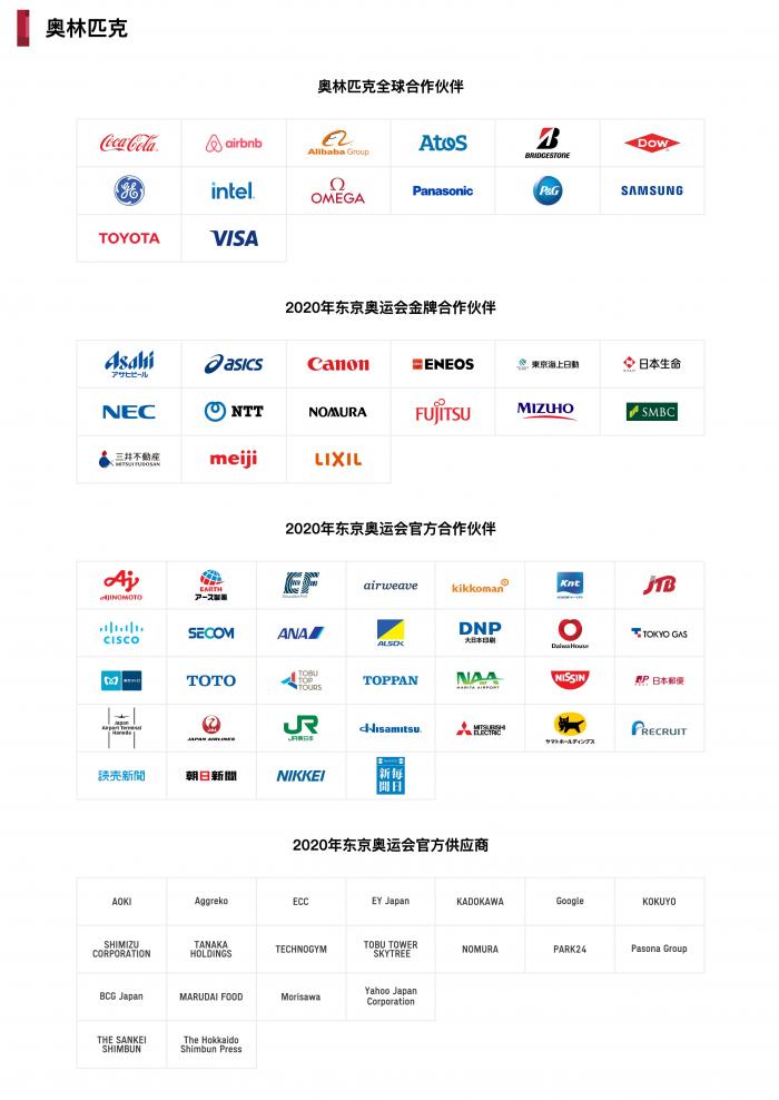 此外还有20家企业,通过提供服务与合作成为东京奥运会“官方供应商”,包括谷歌日本、雅虎日本、波士顿咨询集团等。