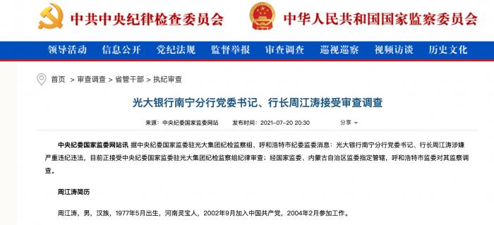 7月20日晚间,中央纪委国家监委网站披露,据中央纪委国家监委驻光大集团纪检监察组、呼和浩特市纪委监委消息:光大银行南宁分行党委书记、行长周江涛涉嫌严重违纪违法,目前正接受中央纪委国家监委驻光大集团纪检监察组纪律审查;经国家监委、内蒙古自治区监委指定管辖,呼和浩特市监委对其监察调查。