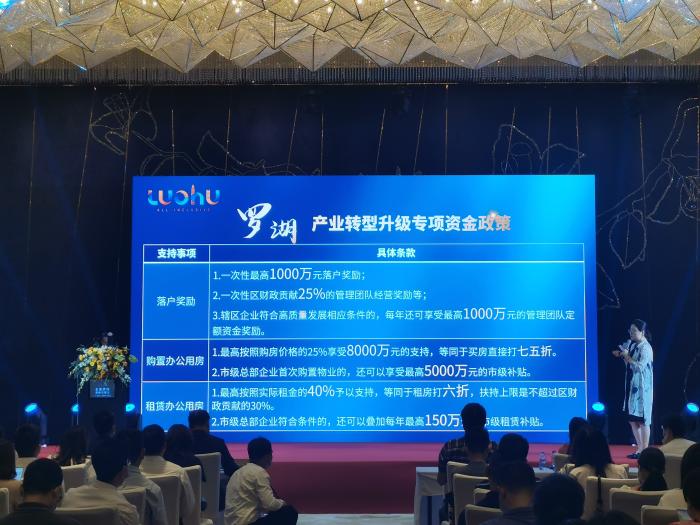 (罗湖区推介产业转型升级扶持相关政策。李婷菊/摄。)