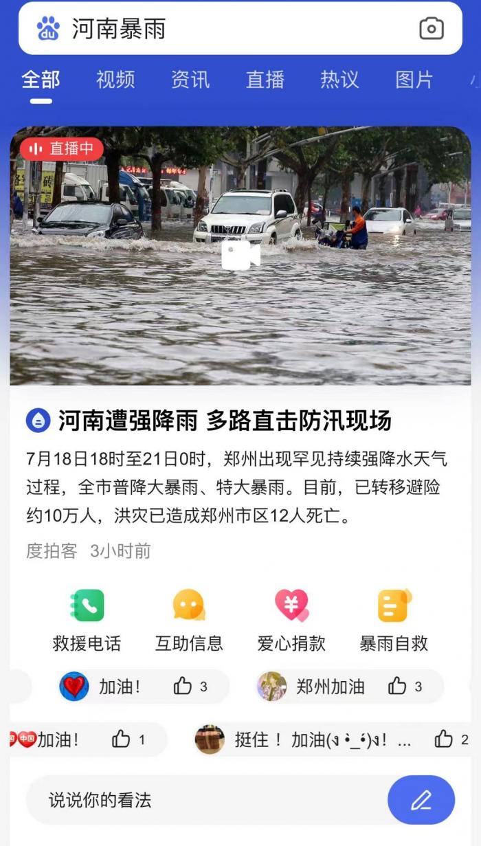 此外,百度App“河南暴雨”专题将第一时间发布汛情相关消息,用户可在页面内查询自救方式和救援电话等信息。