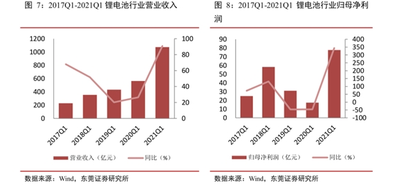 以锂电池的龙头企业为例,宁德时代2021Q1实现营业收入191.67亿元,同比增长112.24亿元,归母净利润19.54亿元,同比增长163.38%;亿纬锂能2021Q1实现营业收入29.58亿元,同比增长125.98%,实现归母净利润6.47亿元,同比增长156.22%。