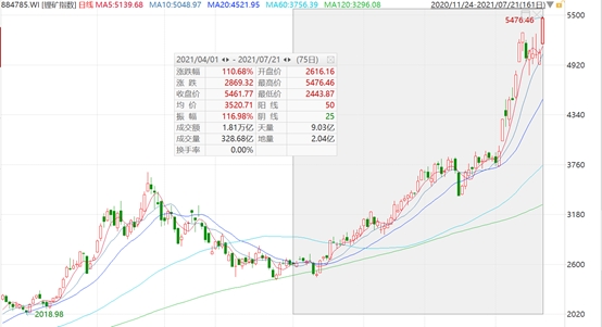 在锂电相关板块中,锂矿指数(884785.WI)近期最为惊艳。该指数从4月份开始启动,截至7月21日午间收盘,75个交易日涨幅达116.98%。指数内涨幅最高的成分股为中矿资源,同期涨幅192.98%。行业两大龙头赣锋锂业涨97.85%,天齐锂业涨109.4%。究其原因,主要是锂相关材料量价齐升。