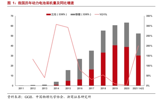 这其中,新能源汽车的拉动最受关注。今年以来国内消费恢复缓慢,但新能源汽车的销售依旧维持高速增长。数据显示,2021年1-6月新能源汽车销量累计120.6万辆,同比增长201.5%;动力电池的装机量6月份累计装车量达52.5GWh,同比增长200.3%。