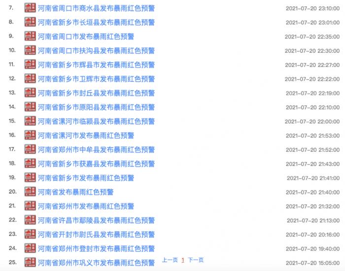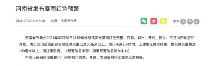 21世纪经济报道记者查询河南省气象台预警信息发现,河南早在7月19日04时15分发布暴雨橙色预警,并在20日15:05发布郑州市巩义市暴雨红色预警,于21:40发布全省暴雨红色预警。