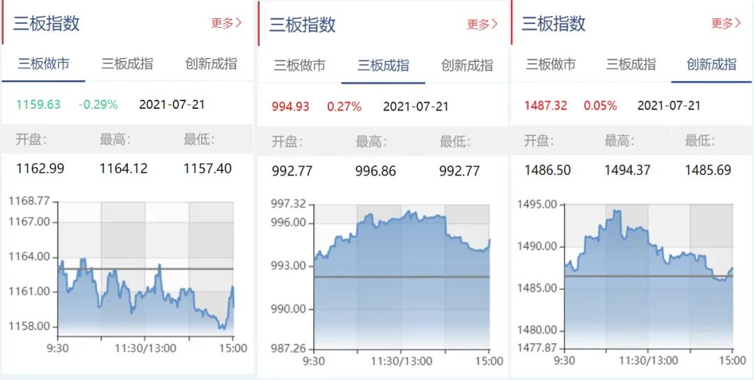 截至7月21日收盘,三板做市报1159.63点,下跌0.29%;三板成指报994.93点,上涨0.27%;三板创新报1487.32点,上涨0.05%。