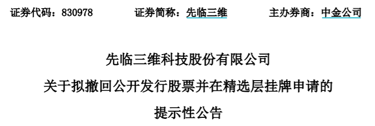 7月21日,先临三维(830978)发布公告称,公司拟撤回精选层申报材料。