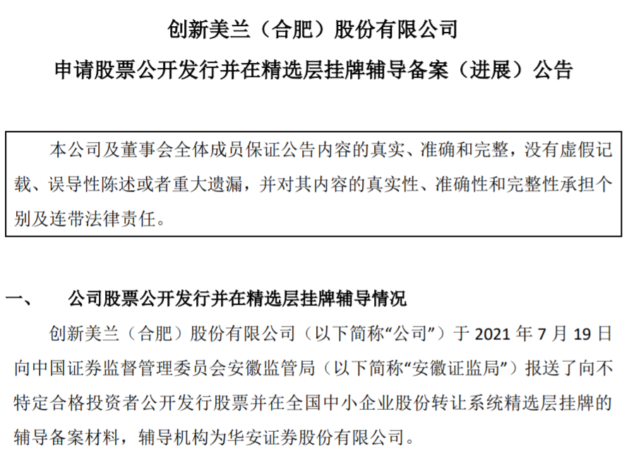 公告显示,美兰股份于2021年7月19日向安徽证监局报送了向不特定合格投资者公开发行股票并在全国中小企业股份转让系统精选层挂牌的辅导备案材料,辅导机构为华安证券股份有限公司。