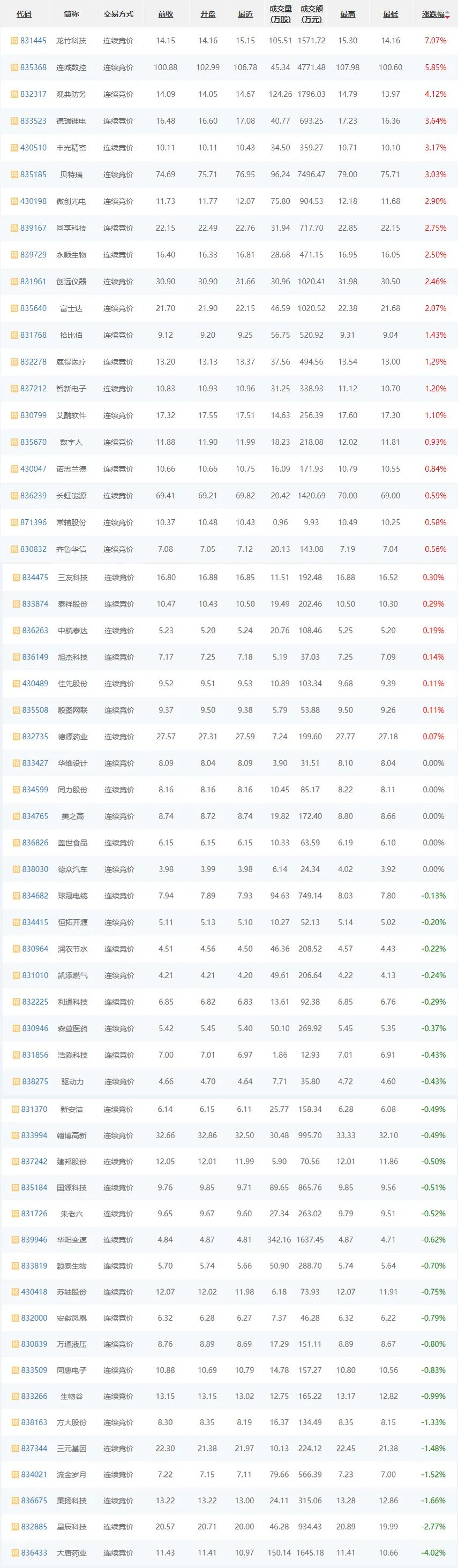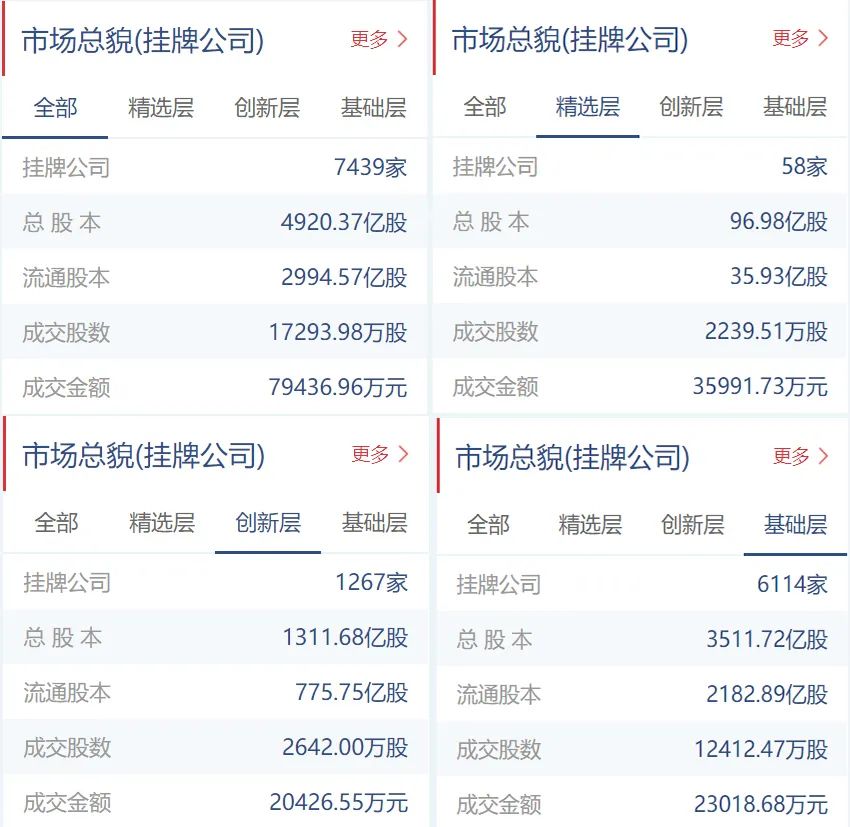 截至7月21日收盘,今日成交金额为7.94亿元,精选层成交金额为3.60亿元,创新层成交金额为2.04亿元,基础层成交金额为2.30亿元;今日成交股数为17293.98万股,精选层成交股数为2239.51万股,创新层成交股数为2642.00万股,基础层成交股数为12412.47万股。