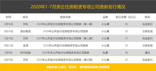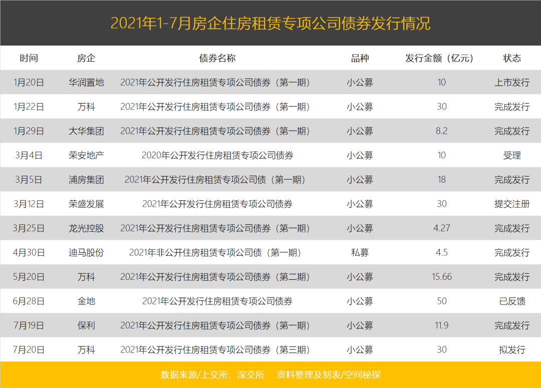 不止是7月,今年的房企住房租赁债券市场,开年就有点热闹。1月和3月分别发行了48.2亿元和62.27亿元,造就了今年以来房企发行住房租赁专项债券的两个小高峰。据空间秘探不完全统计,今年以来共有10家房企发了222.53亿元住房租赁专项公司债券。
