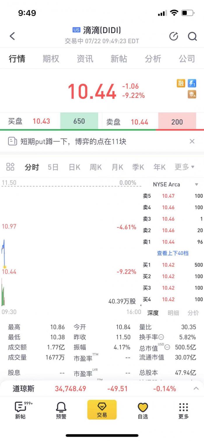 7月22日晚间,滴滴(DIDI)股价跳水,盘中一度大跌超9%。截至发稿,滴滴最新报10.61美元/股,跌7.74%。本月以来,滴滴累计跌幅超过25%,相较18美元的开盘价跌幅达到42%。