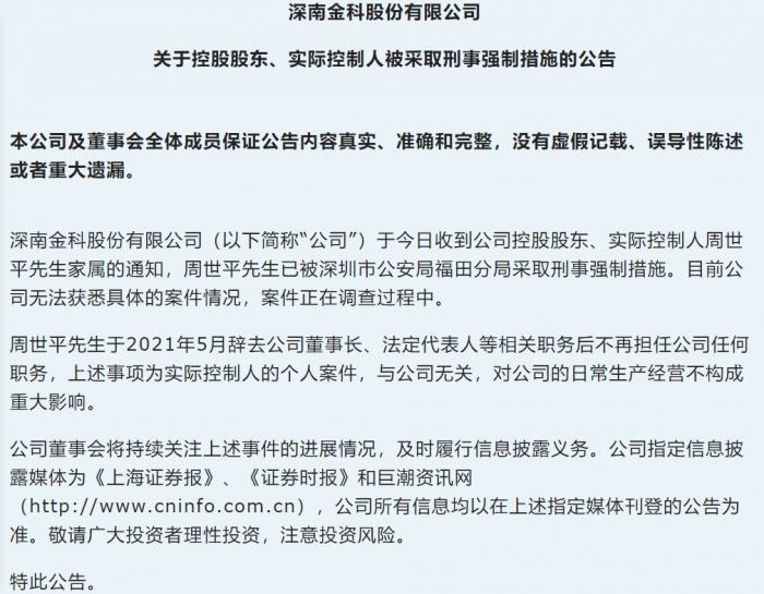 7月22日晚间,深南金科股份有限公司(下称“深南股份”,002417.SZ)发布公告称,该公司控股股东、实际控制人周世平被采取刑事强制措施。