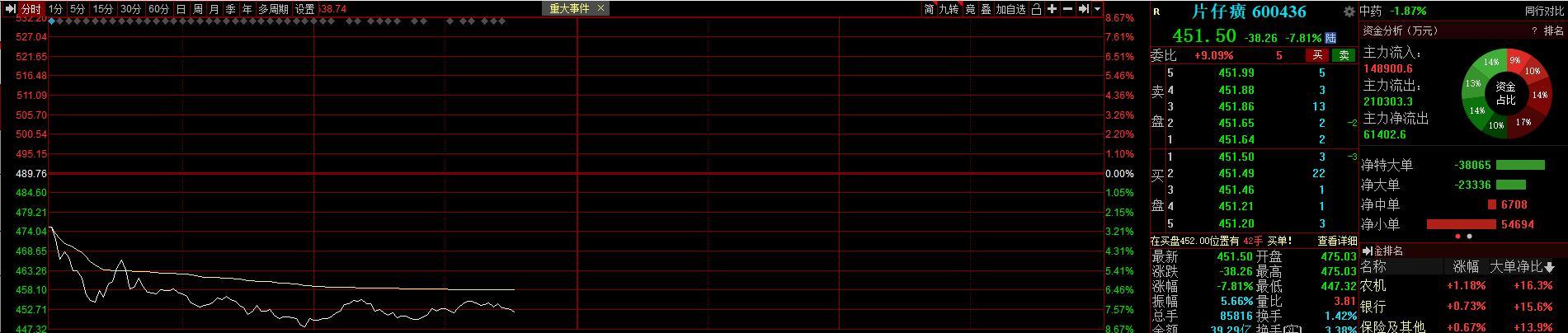 行情显示,片仔癀开盘大跌,盘中最高跌幅超过8.5%。截至发稿,这家公司跌幅为7.81%,股价为451.5元。