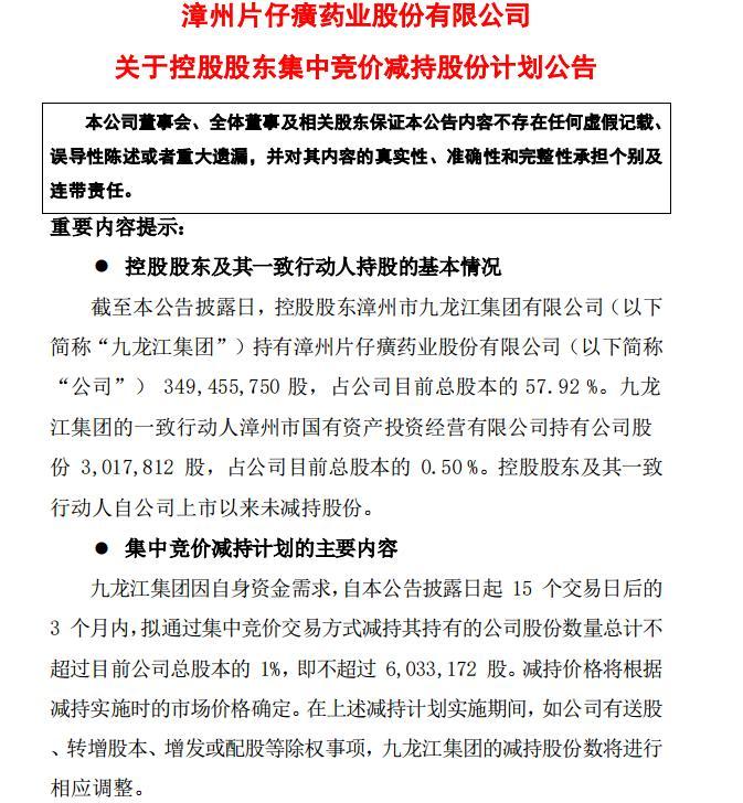 昨晚,片仔癀突然发布公告称,因自身资金需求,控股股东九龙江集团拟减持不超过603.31万股,不超过公司总股本的1%。如果以昨日收盘市值计算,本次拟减持金额或超过29亿元。