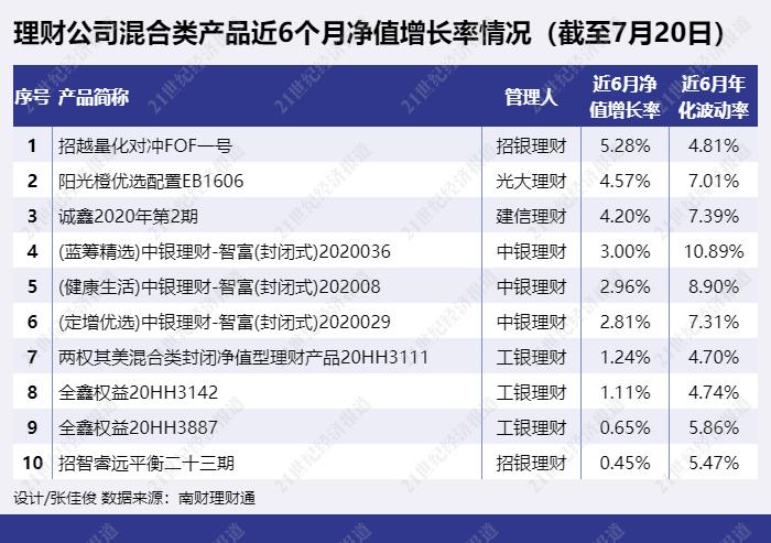 本次榜单中,“(蓝筹精选)中银理财-智富(封闭式)2020036”的波动比较明显,该产品近6月净值增长率为3.00%,近6月波动率为10.89%。