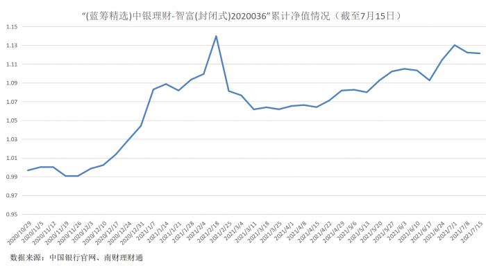 受权益市场影响,一季度该产品波动较大。从“(蓝筹精选)中银理财-智富(封闭式)2020036”累计净值情况来看,2021年一季度,该产品累计净值波动较大,主要原因是一季度权益市场出现大幅波动。事实上,今年春节前以核心资产为代表的股票大幅上涨,指数创出新高。春节后却出现大幅回撤,其中核心资产跌幅相较其余股票更大,整个季度权益市场小幅下跌。
