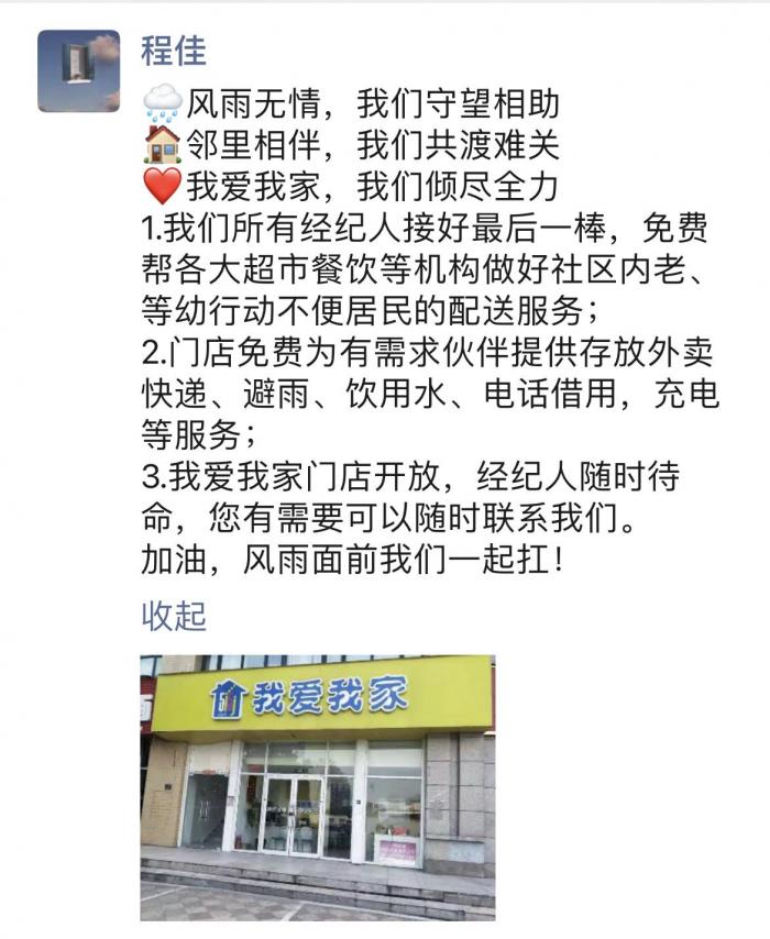 灾情过后,生活物资运力紧张,为了最大限度提升物资运输效率,缓解居民生活物资紧张局面,我爱我家郑州公司全部门店协同各大超市、餐饮等机构做好外卖、食品等社区免费存放,针对社区内老、幼等行动不便居民,则提供免费配送服务,为打通居民生活的“最后一棒”。此外,郑州公司也及时对外公布各个门店电话,为市民提供各种服务支持与帮助。